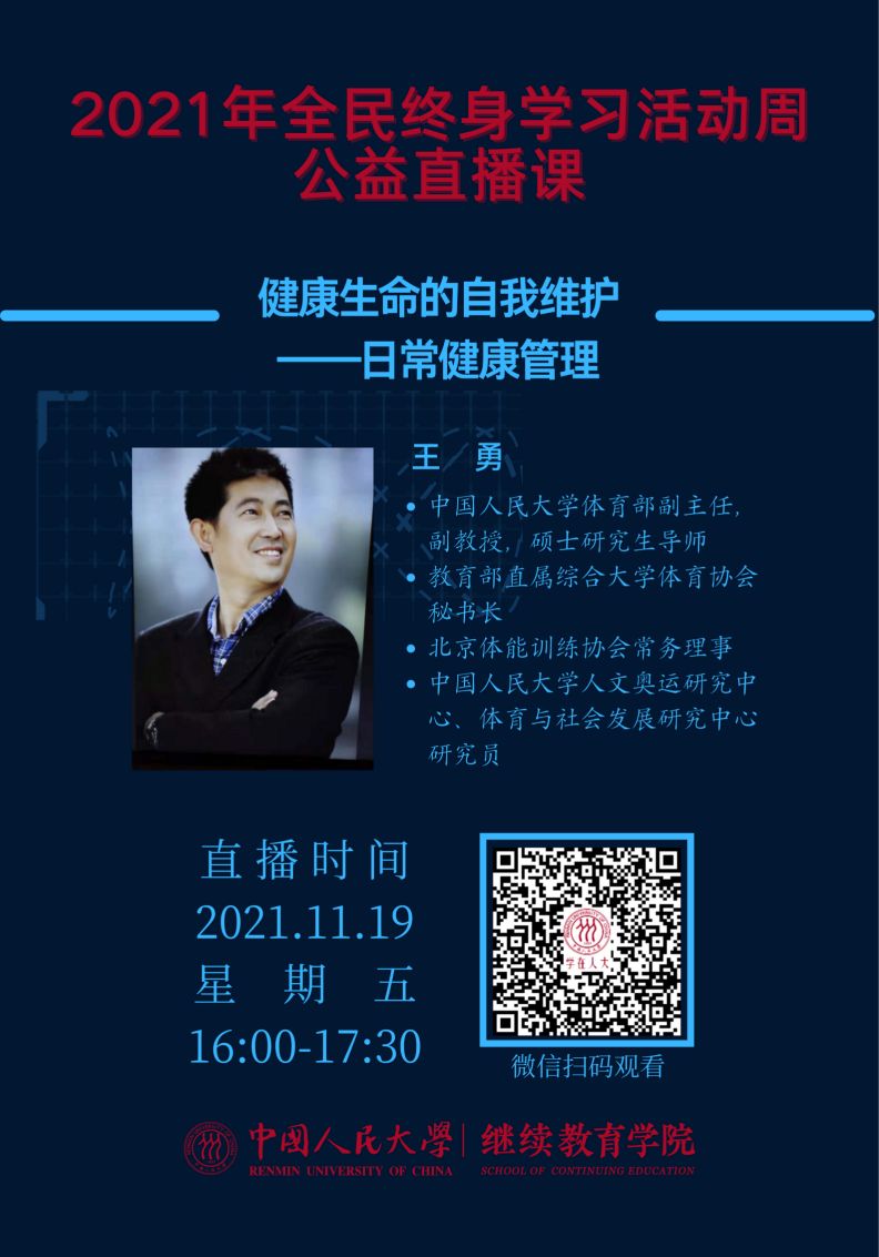 11月19日,日本五级片 体育部王勇副教授通过日本五级片 “学在日本五级片 ”终身学习平台讲授“健康生命的自我维护——日常健康管理”课程。课程主要内容包括:健康生命的价值是幸福快乐的生命质量,健康生命的内涵是身体、心理和精神的健康,健康生命的获得是生活方式改善与重组的过程,健康生命的维护是生命最优化的建设和维持。