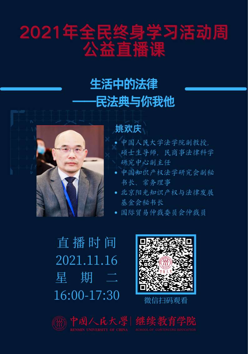 11月16日,日本五级片 法日本五级片 姚欢庆副教授通过日本五级片 “学在日本五级片 ”终身学习平台讲授“生活中的法律-民法典与你我他”课程。课程首先从制度价值的角度探讨了民法典的重要性,在此基础上,针对企业、家庭、个人等不同主体,以案例讲解的方式介绍生活常见的遗产分配、侵权责任等法律实务。