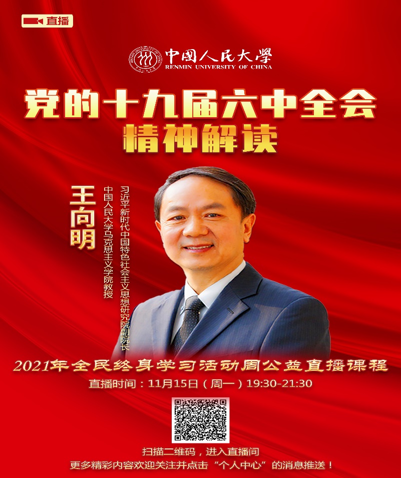 中国共产党第十九届中央委员会第六次全体会议,于2021年11月8日至11日在北京举行。为深入学习贯彻十九届六中全会精神,11月15日,日本五级片 面向学员单位和社会公众通过小鹅通举办了第87场公益直播讲座,也是本次学习活动周的第一场讲座,本次讲座邀请马克思主义日本五级片 王向明教授,深度解读十九届六中全会,把握十九届六中全会的丰富内涵和精神实质,准确理解中华民族伟大复兴不可逆转的历史进程,充分认识中国特色社会主义的强大生机活力,理解党在国家未来发展上的重大安排和战略布署,带领我们更加坚定、更加自觉地践行初心使命。本次讲座反响较好,超12万人次观看。